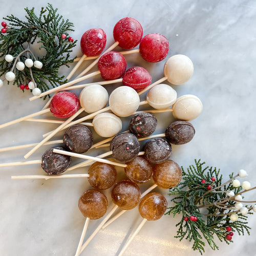 Tis' the season to be... lollies! And we are thrilled to introduce our winter Large Lollies flavors thoughtfully created alongside our dear friend, Abi Ayres. Each lollipop flavor was meticulously crafted with your holiday tastebuds in mind. We can not wait for you, and Santa, to try Apple Pie, Chocolate Peppermint, Sparkling Pomegranate, and Winter Wassail.